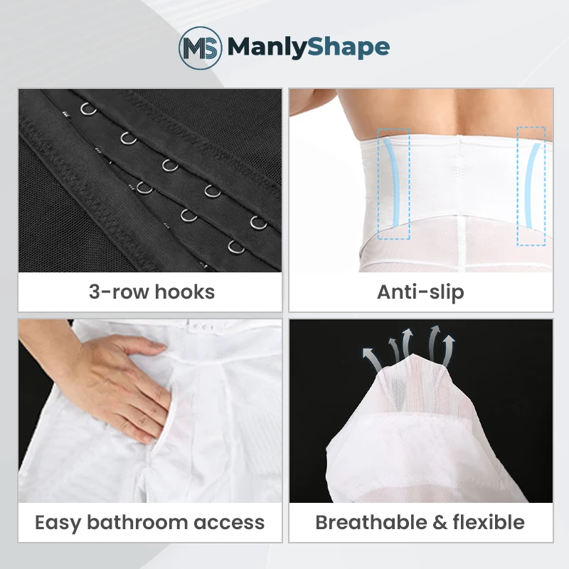 Equipped with 3-row hooks for adjustable fit, anti-slip technology to stay in place, and easy bathroom access for convenience. Made from breathable and flexible material, ensuring comfort throughout the day without compromising on durability.